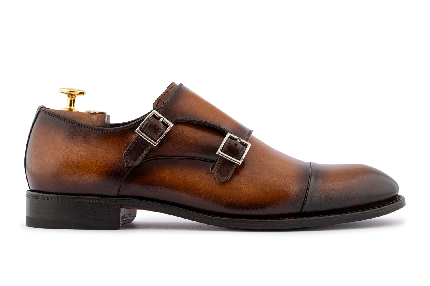 Ce modèle à double boucle est fait de cuir de veau lisse en pleine fleur, peint à la main avec des nuances uniques qui améliorent son savoir-faire. La semelle en cuir avec un insert en caoutchouc sans glissement et une couture "Blake Rapid" assurent la résistance, le confort et l'élégance