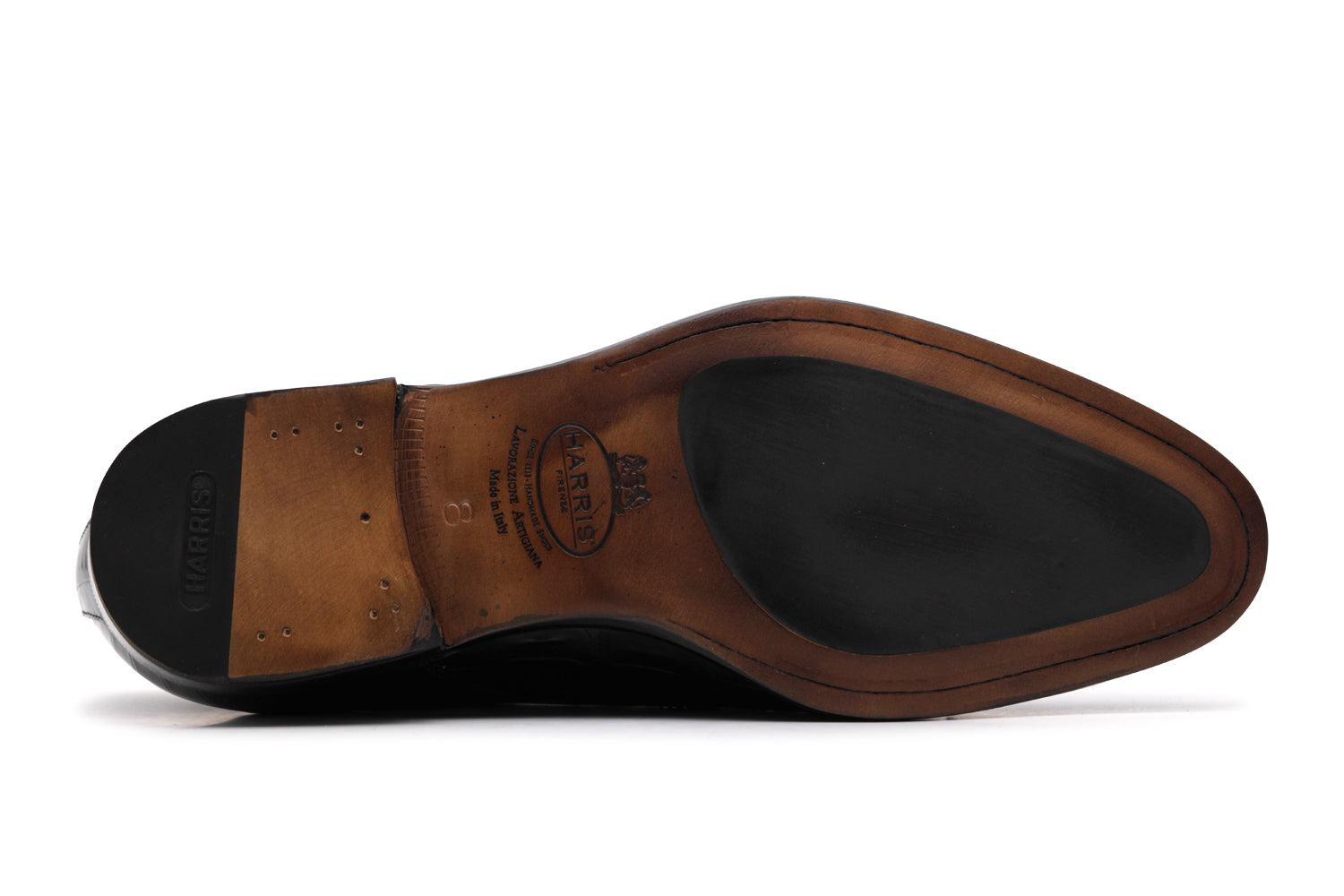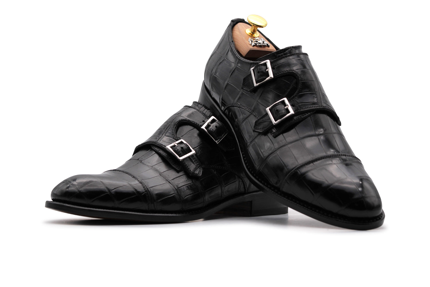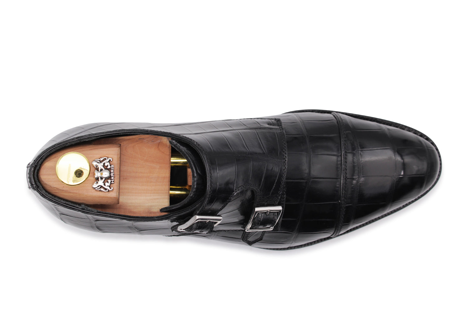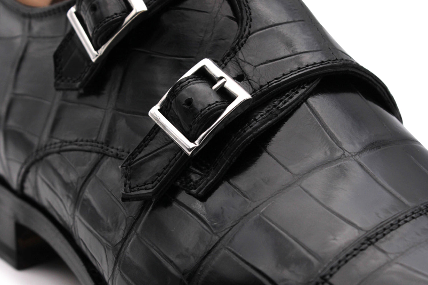 Doppia fibbia in vera pelle di coccodrillo nero lucido. La lavorazione Blake Rapid e la suola in cuoio con inserto antiscivolo definiscono un modello iconico e simbolo di lusso assoluto.