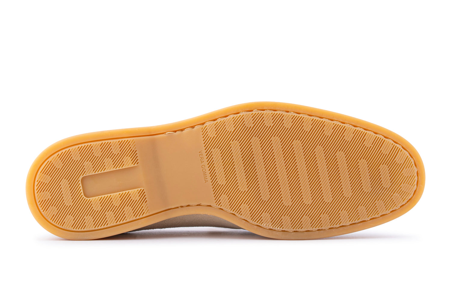 Pelle scamosciata color avorio con dettagli cuciti interamente a mano e passante imbottito per un comfort assoluto. La suola in gomma leggera color miele si sposa perfettamente con la solida lavorazione Blake Rapid.