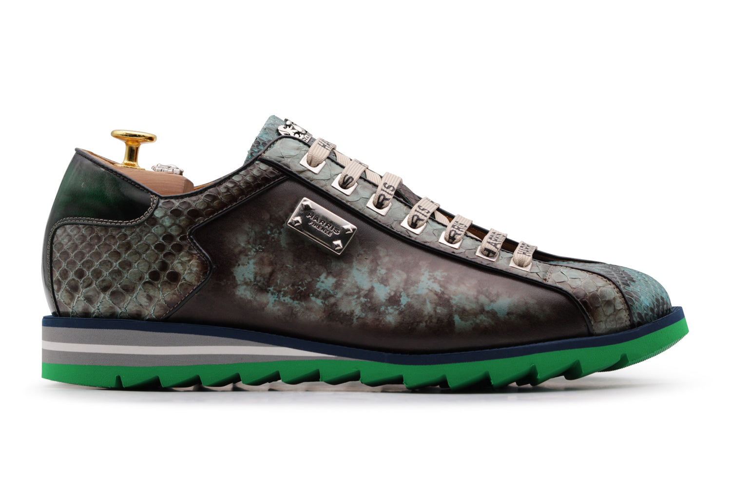 Estilo y funcionalidad, inspiración deportiva y carácter lujoso. Esta zapatilla Harris Men está hecha de una piel natural de pitón natural muy preciosa. Pintado y desvanecido a mano y enriquecido por la marca Harris en metal, se caracteriza por la gran planta con punta redonda y la suela de cassette que garantiza la máxima comodidad durante todo el día.