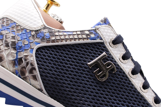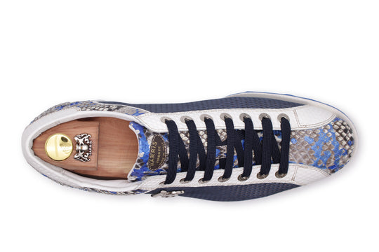 Un'icona di stile che unisce lusso e comfort. La nostra sneaker con dettagli in vera pelle di Pitone su punta, linguetta e tallone ed una stampa effetto traforato laterale è il risultato di una lavorazione artigianale d'eccellenza. Queste calzature sono dotate di una suola runner in gomma, progettata per offrire un comfort superiore e una dinamicità senza pari, assicurando al contempo un'estetica esclusiva e all'avanguardia. L'accessorio Harris nikel aggiunge un segno distintivo di esclusività.